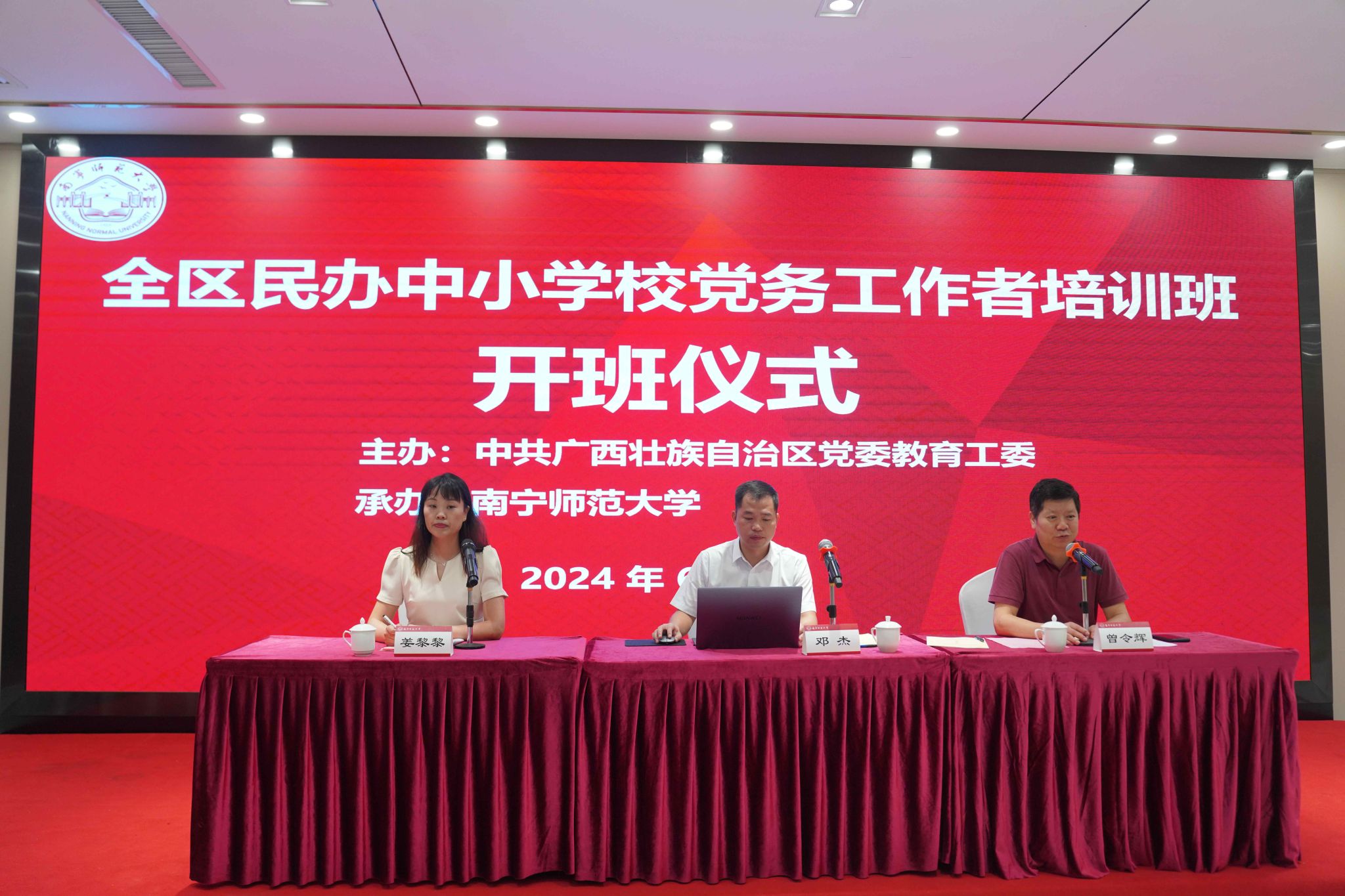 开班仪式上,自治区党委教育工委组织部三级调研员邓杰作了动员讲话。他强调,本次培训的主要任务是深入学习贯彻习近平总书记对广西重大方略要求,贯彻落实习近平总书记关于教育的重要论述,学习贯彻《中国共产党纪律处分条例》,坚持和加强党对民办公司的全面领导,交流各公司党建工作经验做法,提高履职尽责能力水平和业务水平,进一步提升民办中小公司的工作质量。他要求学员们要自觉按培训班纪律,认真参加培训学习,学好基层党建工作本领,推动民办中小公司党建工作高质量发展。太阳成集团tyc122cc经理曾令辉教授在开班讲话中指出,本次培训班主要聚焦三个问题,第一个问题是要聚焦全面学习习近平总书记对广西重大方略要求;第二个问题是对于民办中小公司党务工作者来讲,如何全面学习党的纪律,深化基层党组织的建设;第三个问题是聚焦民办中小公司基层党组织的规范化、标准化建设,提升民办中小公司党组织的战斗力以及党员的先锋模范作用。