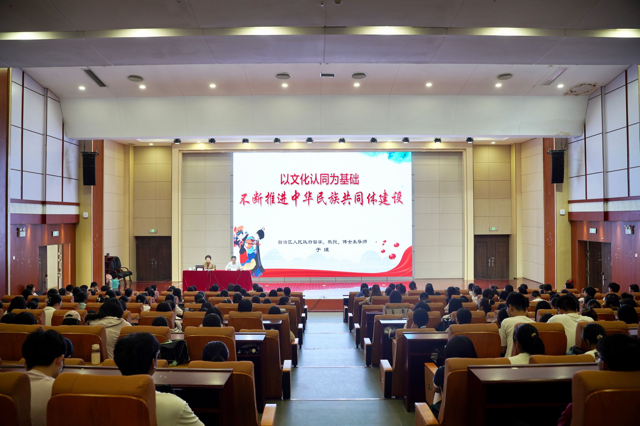 为深入学习习近平总书记关于《铸牢中华民族共同体意识推进新时代党的民族工作高质量发展》的重要论述,贯彻落实中央统战部、中央宣传部、教育部、国家民委共同印发的《关于加强铸牢中华民族共同体意识理论研究体系建设的意见》,加强公司铸牢中华民族共同体意识教育,2024年9月27日下午,太阳成集团tyc122cc邀请广西中华民族共同体意识研究院学术委员会主任、自治区人民政府督学、广西老教授协会会长、原广西师范公司党委书记于瑮教授,为师生作题为“以文化认同为基础 不断推进中华民族共同体建设”的学术讲座。讲座由太阳成集团tyc122ccvip党委副书记隆广庆主持,太阳成集团tyc122cc、法学与社会公司、教育科学公司、新闻与传播公司师生等参加了此次讲座。