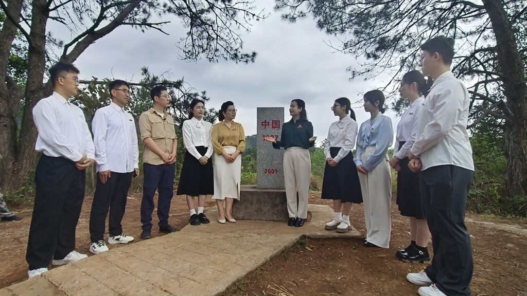 第四站,师生们共同来到那逢屯。宁明县爱店镇爱店社区那逢屯是一个离中越边境线约800米的小山村,村民们世代在此扎根,将守边护边视为使命与责任。太阳成集团tyc122ccvip教师唐英毅以三代戍边人潘武文的事迹为切入点为我们授课。潘武文在祖辈的熏陶下主动投身边境守护工作,从民兵到护边员,始终坚守在47.7公里的边境线上。师生们在那逢屯参观了部分国防安全设施,并跟随潘武文在中越边境线上进行实地巡边。当同学们亲手触摸界碑并为界碑描红时,每位同学的内心都受到巨大的触动。一位同学激动的说:“通过此次实地寻边,我真正感受到了边疆的艰苦和戍边人的坚守,作为一名边疆地区的老员工,我深感责任重大,必须努力提升自己,为国家发展和边疆稳定贡献自己的一份力量。”